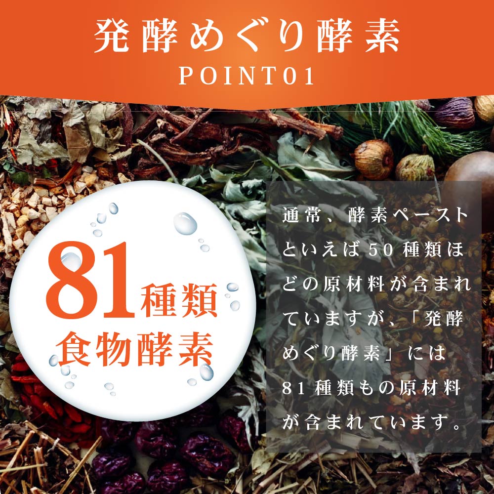 | 原材料名 | 植物発酵エキス(糖類(糖蜜(国内製造)、黒佐藤、オリゴ糖)、野草類(ヨモギ、ウコン、ドクダミ、ハスの葉、高麗人参、センシンレン、オトギリソウ、クマザサ、タンポポの根、霊芝、アマチャヅル、トチュウ葉、オオバコ、カンゾウ、マツ葉、ナンテンの葉、アマドコロ、ツユ草、ツルナ、マカ、トンカットアリ、ハブソウ、ハト麦、スギナ、ビワ葉、ラカンカ、クコの実、レンセンソウ、モモの葉、イチョウ葉、ニンドウ、イチジクの葉、ベニバナ、エゾウコギ、エンメイソウ、モロヘイヤ、セッコツボク、アカメガシワ、クコ葉、カキの葉、カミツレ、カリン、シソ葉、桑葉、メグスリの木、田七人参、キキョウ根、ナツメ、サラシア、マタタビ、エビス草の種子、紅参、アガリクス、ルイボス、アムラの実、タマネギ外皮、キャッツクロー)、果物類(ウメ、キンカン、イチジク、ミカン、パインアップル、リンゴ、グレープ、メロン、レモン、グレープフルーツ、アンズ)、野菜類(トウガラシ、ショウガ、シイタケ、ニンジン、タマネギ、パセリ、キャベツ、ゴボウ、モヤシ、ニンニク)、海藻類(コンブ、フノリ))、生姜粉末(一部にリンゴを含む) |